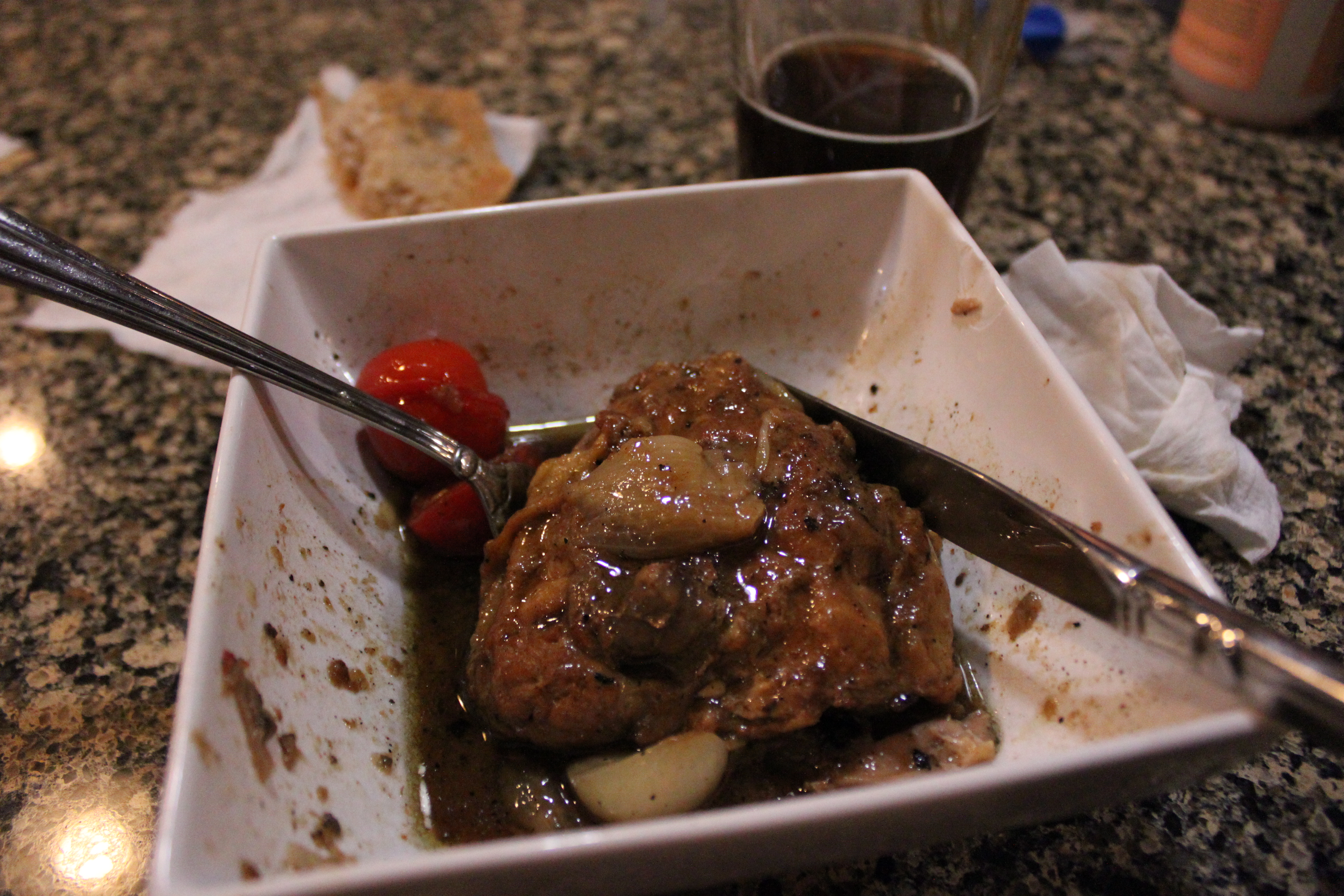 The beer swap worked perfectly, and this has easily become the best dish I’ve ever made at home. Hell, it’s one of the best things I’ve ever put in my mouth. Period. And as I sopped up the delicious chicken juices with a crusty piece of bread I realized, “This tastes a lot like the infamous chicken dish we had in Rochefort!” Stay tuned for future posts as I try to morph this simple recipe into the best meal we had in Belgium.